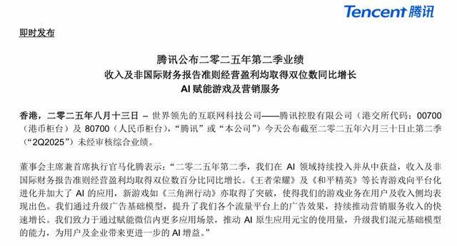 董事会主席兼首席执行官马化腾表示:“二零二五年第二季,我们在 AI 领域持续投入并从中获益,收入及非 国际财务报告准则经营盈利均取得双位数百分比同比增长。《王者荣耀》及《和平精英》等长青游戏向平台化 进化并加大了AI的应用,新游戏如《三角洲行动》亦取得了突破,使得我们的游戏业务在用户及收入侧均表 现出色。